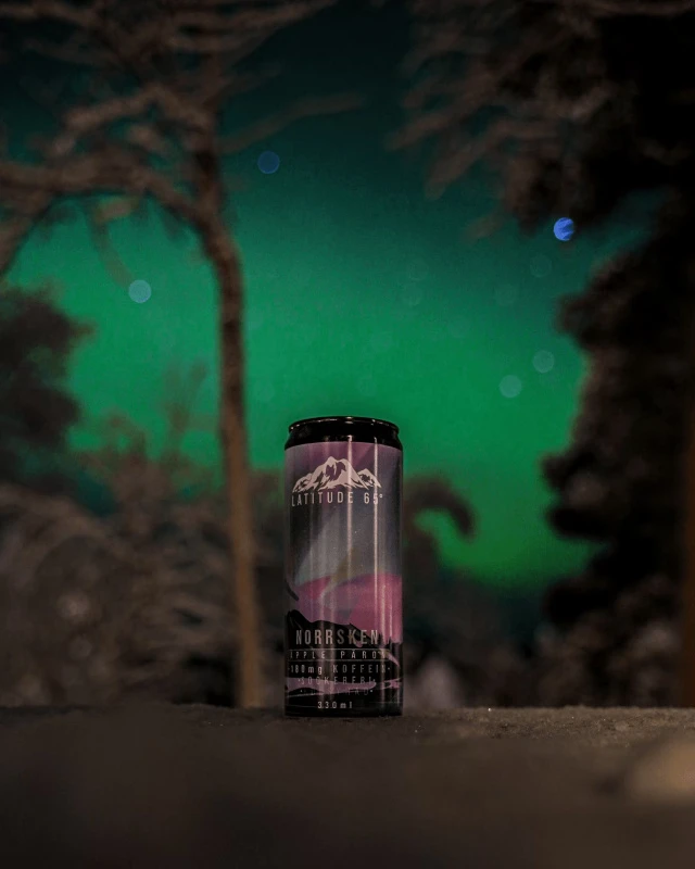 Norrsken van Latitude 65. Suikervrije en koolzuurhoudende functionele drank met appel/peer smaak. Verrijkt met vitaminen, mineralen en 180mg cafeïne.