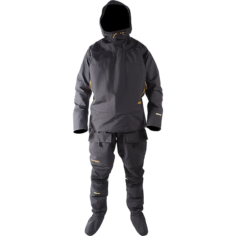De zakken op de jas zijn groot en hebben spatwaterdichte ritsen. De plaats van de zakken maakt ze gemakkelijk te gebruiken, zelfs als je een zwemvest draagt. De jas is ook uitgerust met drie bevestigde D-ringen, één in de nek en twee aan de achterkant. De D-ring in de nek kan worden gebruikt om het net aan op te hangen en de twee andere kunnen worden gebruikt om andere uitrusting aan op te hangen. De zakken op de broek bevinden zich aan de voorzijde van de dijen. De broek is voorzien van splash a guard die de sokken beschermt en over rubberen laarzen of normale laarzen kan worden getrokken.