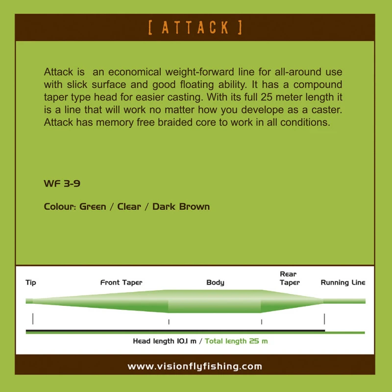 Vision Attack WF is een vliegenlijn die gemakkelijk uit te draaien is en zich goed laat zien in de stroom. Een echte allround lijn voor zowel beginners als professionals!